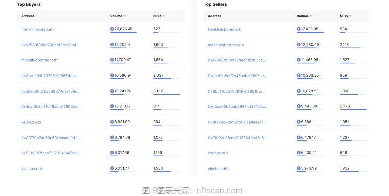 从图9TopBuyers和TopSellers的排行榜数据可以看出,大额买家与卖家的钱包地址出现高度重合,他们也或将是Blur空投的最大收益者,代币正式上线后,我们可以跟踪这十个地址的进出情况。