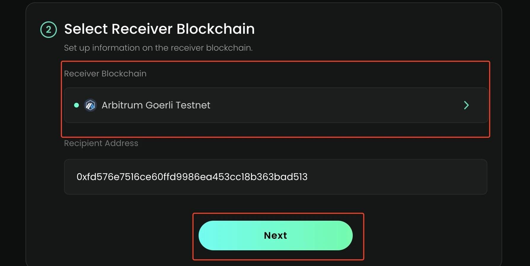 选择你要将NFT转移到哪个测试网络,我这里选的?Arbitrum?Goerli测试网,前提是你需要把?ETH?Goerli测试代币跨链到?Arbitrum?Goerli测试网上,以用于最后领取NFT的手续费。可以在这里完成,跨链时间大于10分钟,请耐心等待。然后点击下一步。