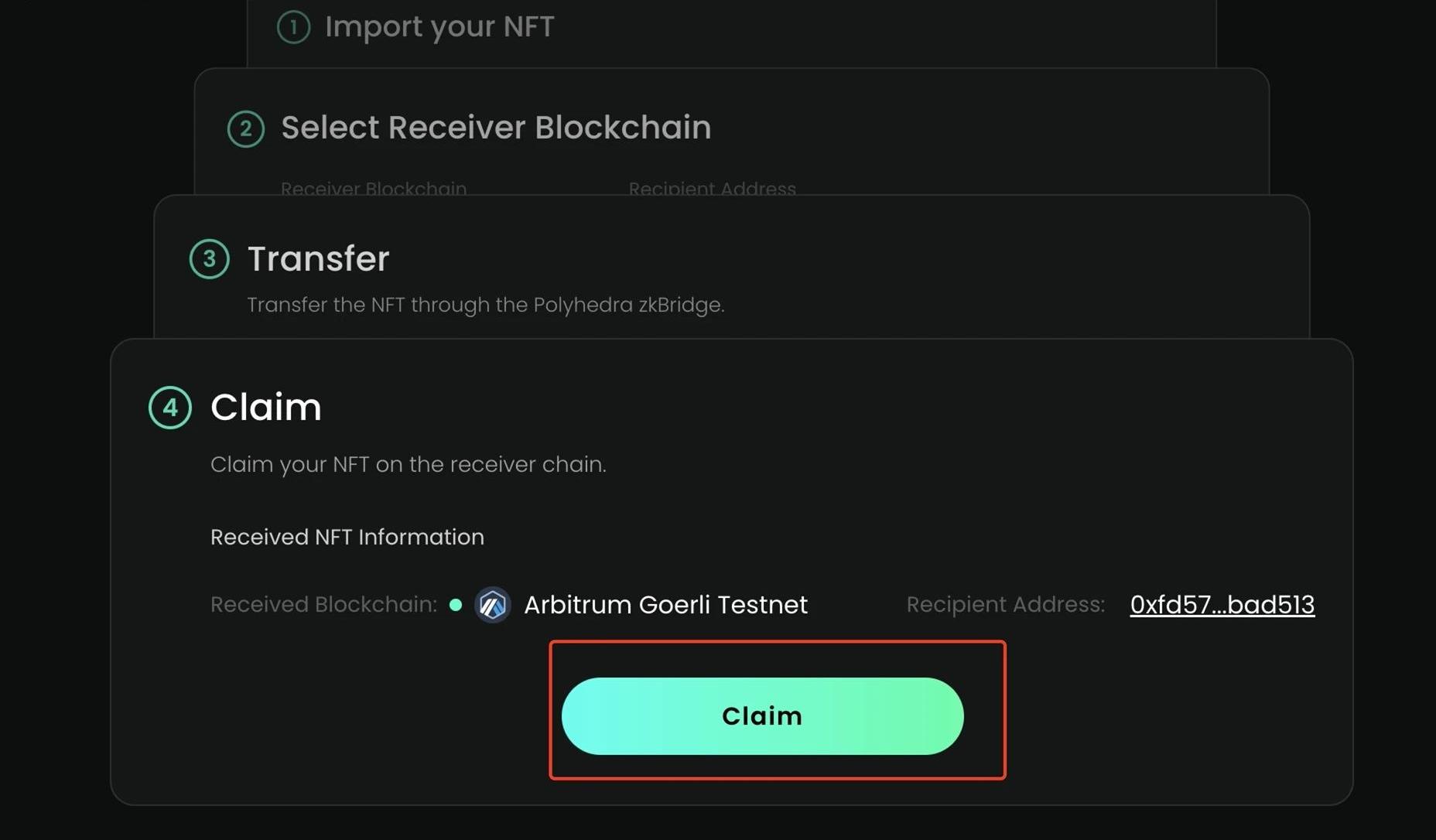 转移成功后,就可以点击“领取”,你的NFT就从?ETH?Goerli测试网转移至?Arbitrum?Goerli测试网了。如果出现一直领取不上的情况,建议更换一下测试网络。