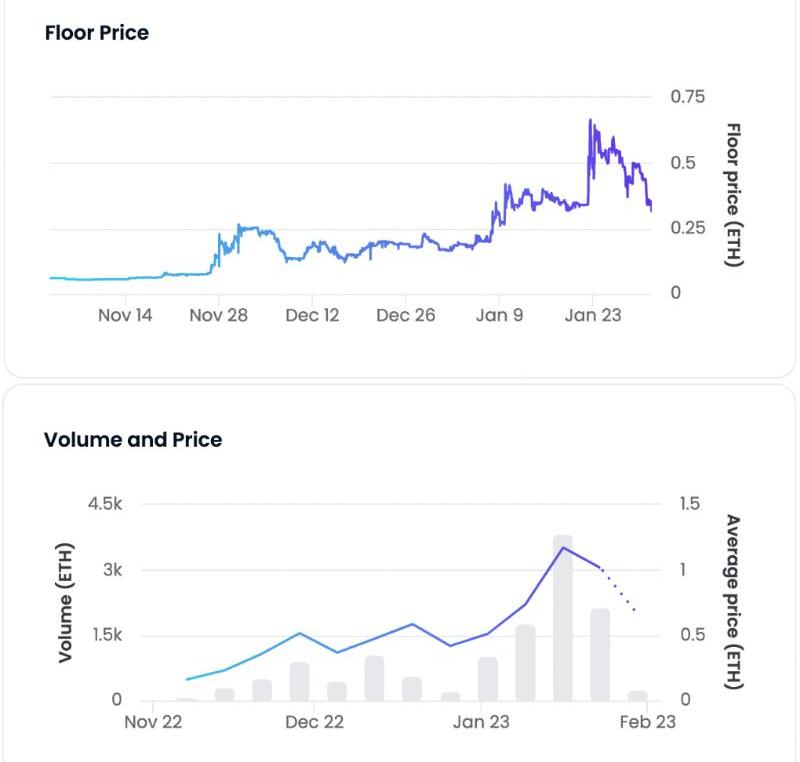 NFT系列在过去三个月经历了大规模的牛市。所有NFT的综合市值从2022年11月的2.7KETH反弹到今天的近50K,涨幅超过17倍。综合市值在2023年1月23日创下了71.8KETH的历史新高。与此同时,持有NFT的单一钱包数量也从同期的3.5K增加到6.2K,增长了76%。