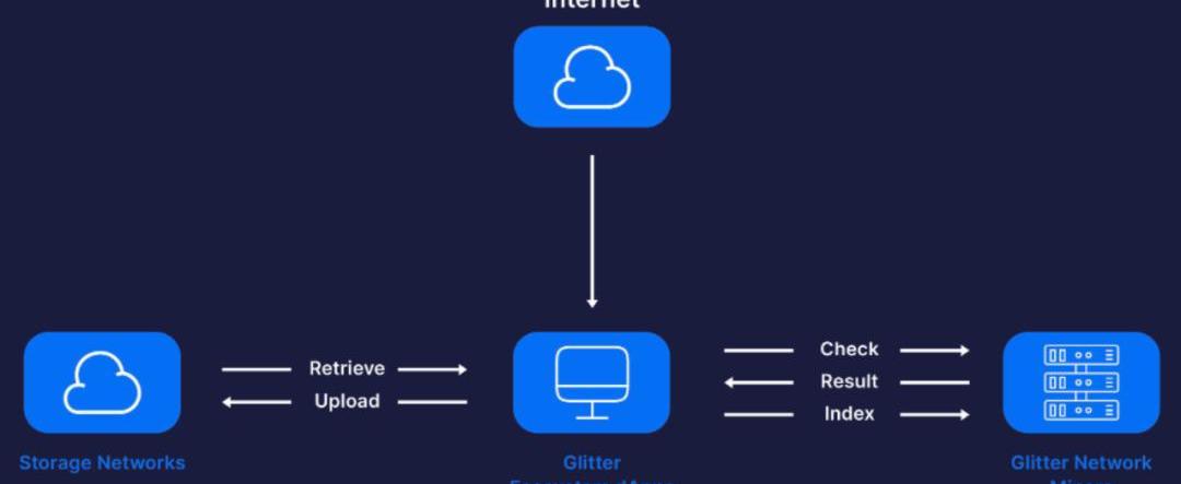该图描述了Glitter的运作模式,Glitter生态的去中心化APP负责上传和接收储存网络上的数据,并把任务分发给Glitter网络矿工们,并接收他们对数据进行检查和索引的结果。而外界可以通过该中心化APP访问到最终的索引结果。