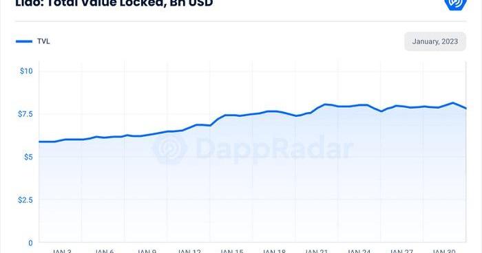 DeFi市场在2023年1月出现复苏迹象,总锁定价值(TVL)环比增长26.82%?,达到746亿美元。DeFi市场在最近加密货币价格的上涨中受益匪浅,似乎预示着牛市趋势的到来。