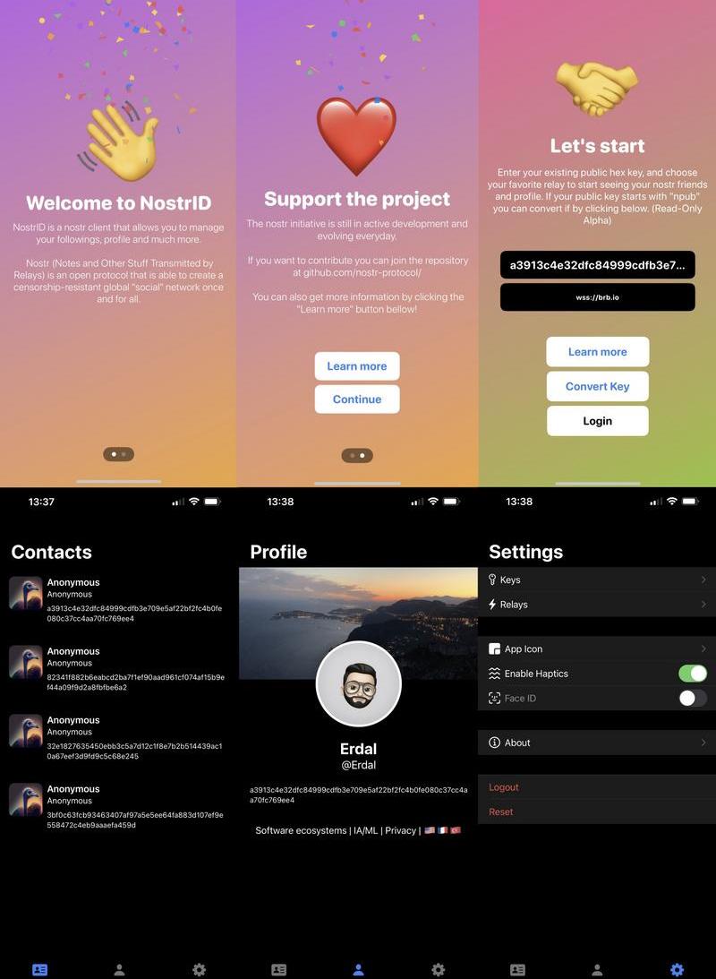 在?Nostr?协议上构建的产品,都无需账号密码,而是使用私钥登陆、用公钥做身份?ID。用户可导入自己的私钥,也可直接随机生成新私钥。