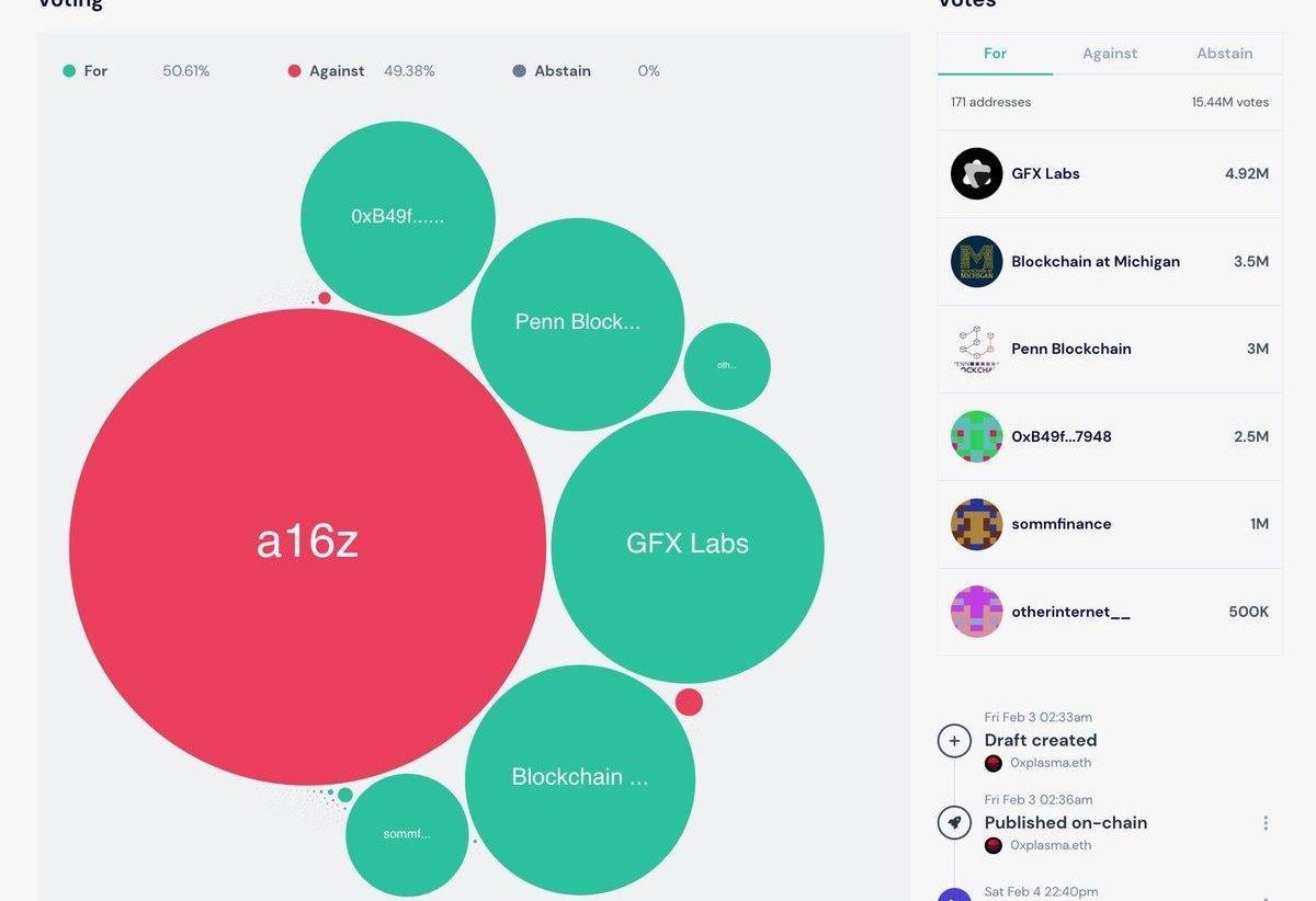 但这当然不是最终结果,因为a16z并未投票。要知道,A16z拥有1500万个UNI代币,他们为何不投票?难道不支持LayerZero吗?
