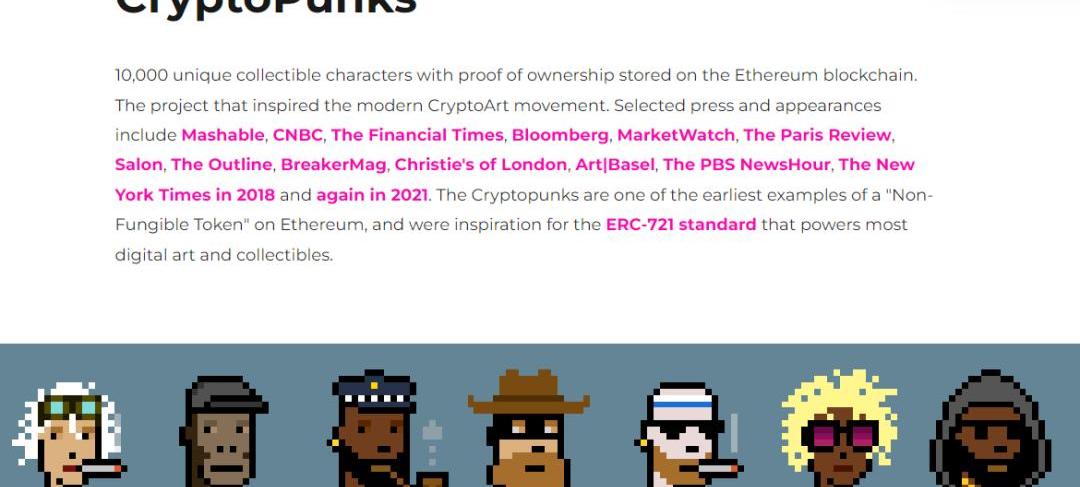 CryptoPunks被广泛认为激发了NFT世界的许多发展,包括个人资料图片(PFP)项目、ERC-721标准和10,000的标准供应量。除了这些创新之外,CryptoPunks市场也是开创性的,并且一直沿用至今,部分原因是它嵌入了V2代码中。然而,市场随着时间的推移而发展。开发商LarvaLabs对市场进行了一系列改进,形成了今天的CryptoPunks标志性品牌。目前可以在OpenSea上购买WrappedCryptoPunksV1,可以在CryptoPunks.app上购买CryptoPunksV2。