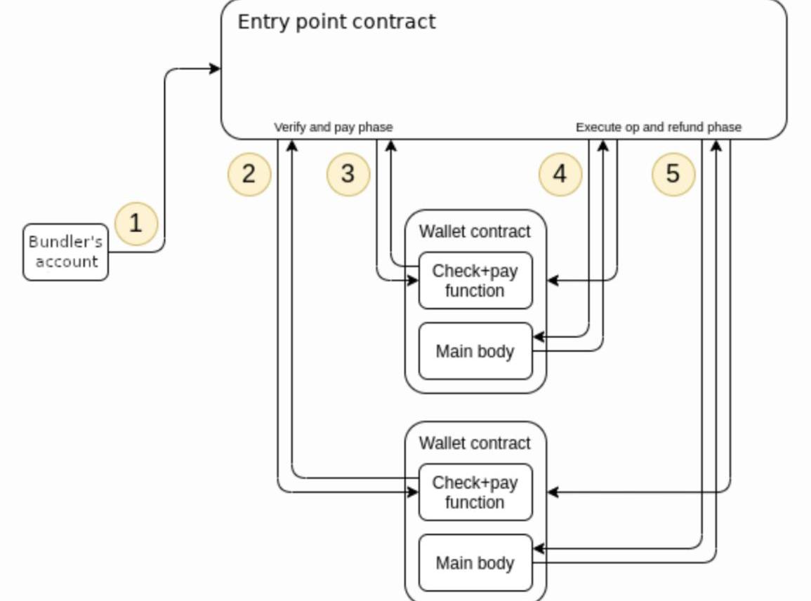 验证循环:入口点合约通过每个UserOperation并调用SenderContract中的「检查功能」。SenderContract运行此功能以检查UserOperation的签名并补偿打包这些交易的Bunder。