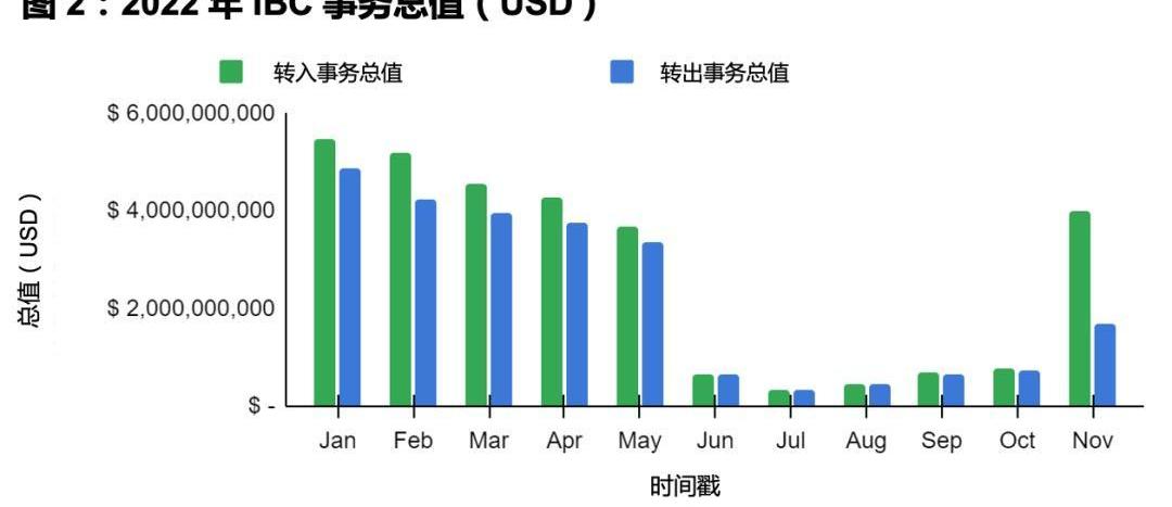图2显示了转入和转出的IBC事务总值。虽然今年大部分时间的事务量一直在下降,但我们可以看到跨链事务总值似乎从11月开始逐步恢复。