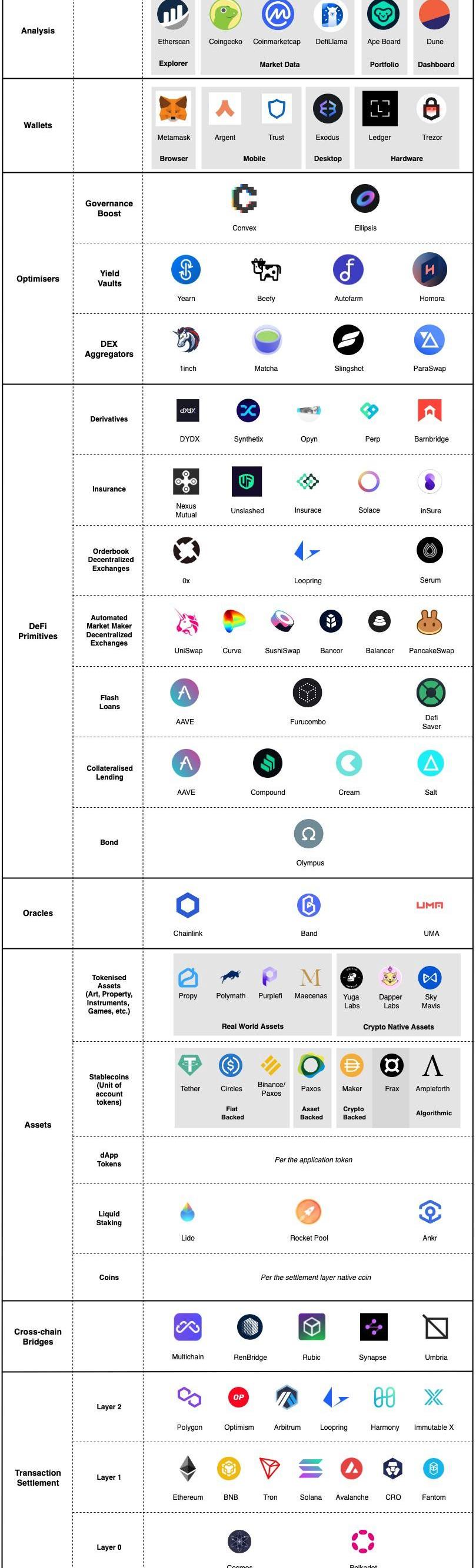 分析:它们是帮助大众理解区块链交易数据的应用程序和工具。这些都是只读应用程序,有助于加强领域的透明度。钱包:用户拥有的钱包,用于存储和管理用户的私钥。这些自保管钱包支持交易签名以及用户与DeFi协议的交互。优化器:一组构建在DeFi原语之上的应用程序,目的是通过实现特定策略来实现收益最大化。DeFi原语:DeFi生态系统的构建块,其中每个协议提供特定的金融功能。这些原语可以很容易地与其他原语组合。预言机:数据提供者,使DeFi协议能够摄取外部数据,以便在智能合约中进行逻辑处理。资产:在DeFi生态系统中进行交易的项目/事物,通常以代币的形式表示(ERC20/721)。跨链桥:使资产能够安全地跨各种链移动的协议。交易结算:DeFi的基础层,所有交易都在这里完成并得到保护。下面的部分通过详细阐述每一层的核心功能、基本概念以及生态系统效益,概述了每一层的组成部分。每个部分按易读性排序。此外,还提供了一个非结论性的协议列表,作为每个部分的参考实现。