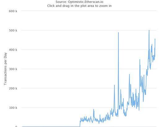 Optimism的每日交易量正在猛增,达到每日50万笔交易的历史最高水平。作为参考,以太坊每天处理的交易量是这个数字的两倍多,约为100万笔。
