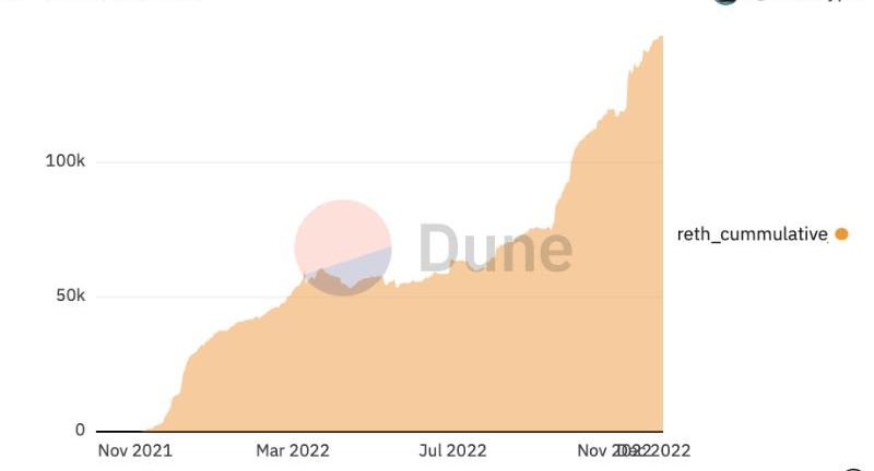 尽管它是累积的,但RocketPool的不同关键指标的采用量正在加速增加。主要指标是流通中的rETH数量,它已经飙升到了15万rETH以上的新高度。作为参考,这个数字在9月时还只有75,000,这意味着他们在3个月内将总供应量翻了一番。