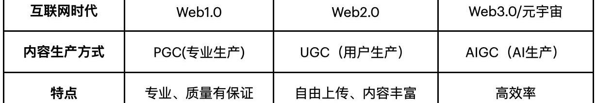 互联网内容生产方式经历了PGC——UGC——AIGC的过程。PGC是专业生产内容,如Web1.0和广电行业中专业人员生产的文字和视频,其特点是专业、内容质量有保证。UGC是用户生产内容,伴随Web2.0概念而产生,特点是用户可以自由上传内容,内容丰富。AIGC是由AI生成的内容,其特点是自动化生产、高效。随着自然语言生成技术NLG和AI模型的成熟,AIGC逐渐受到大家的关注,目前已经可以自动生成文字、图片、音频、视频,甚至3D模型和代码。AIGC将极大的推动元宇宙的发展,元宇宙中大量的数字原生内容,需要由AI来帮助完成创作。