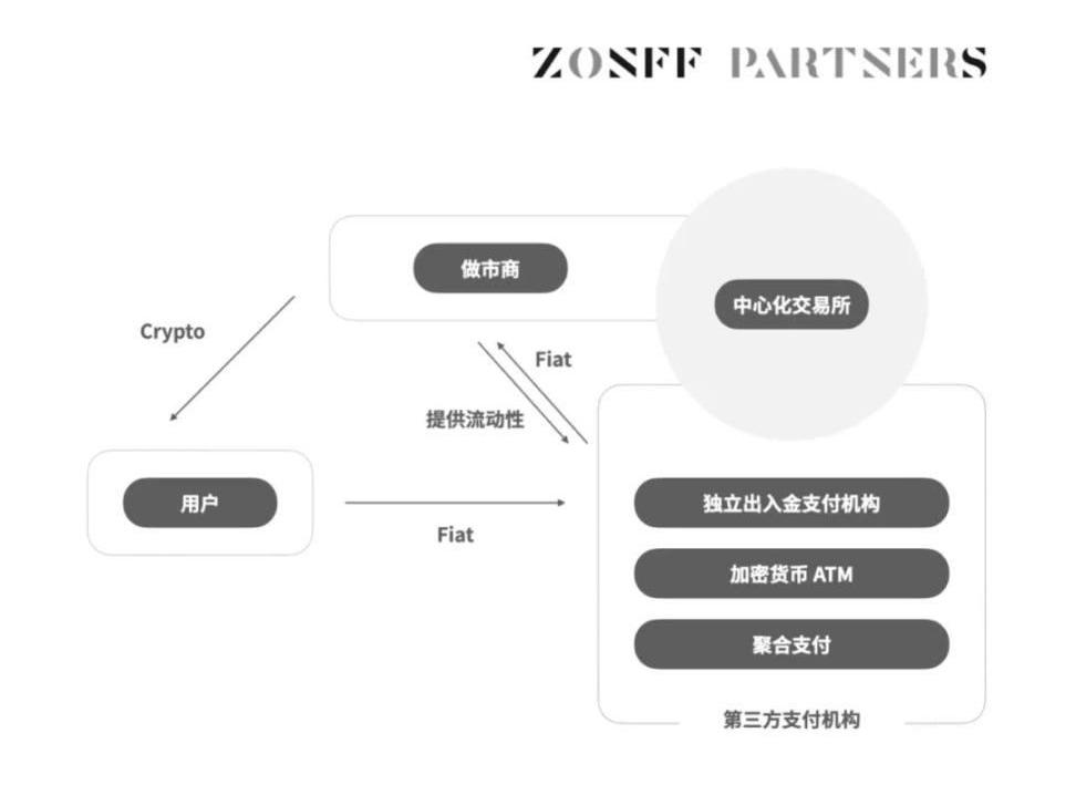 在一些国家地区获得牌照的中心化交易所会自己做出入金支付,用户可以通过借记卡/信用卡或银行转账直接购入加密货币。大多数情况下中心化交易所会搭建P2P撮合平台,通过P2P的方式让用户给中心化交易所地址入金,也因此中心化交易所入金往往费率最低。但在一些没有P2P交易习惯或被法律监管明令禁止的地区如欧美地区,中心化交易所需要接入独立出入金支付机构作为底层渠道来完成用户出入金的目的。