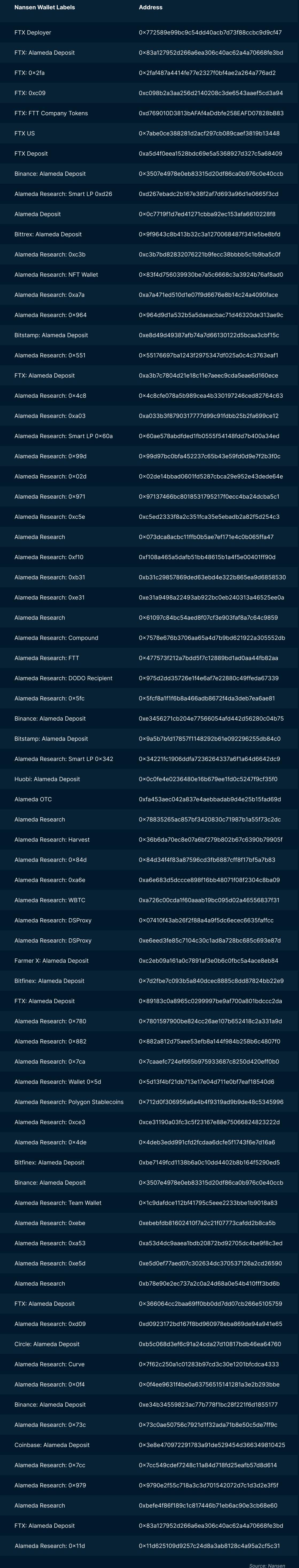 我们还密切关注了一组钱包地址,我们将其标识为FTX或Alameda的地址,您可以在附录部分中查看地址和标签列表。