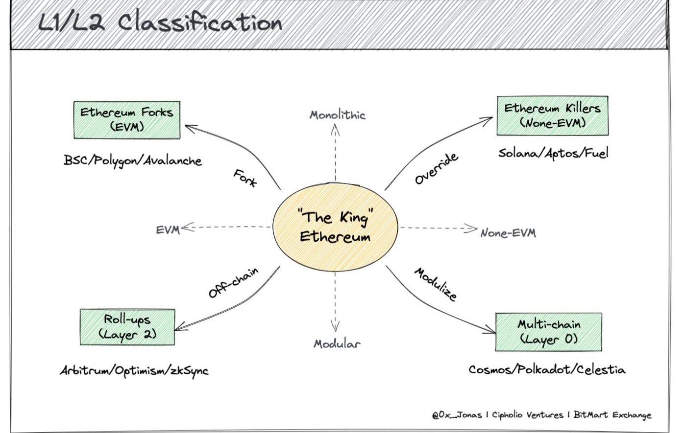 第二种是同样支持EVM的模块化链,也就是常说的Layer2扩容方案。Layer2作为以太坊的横向扩展,通过分离执行层的架构提升以太坊的整体运行效率。