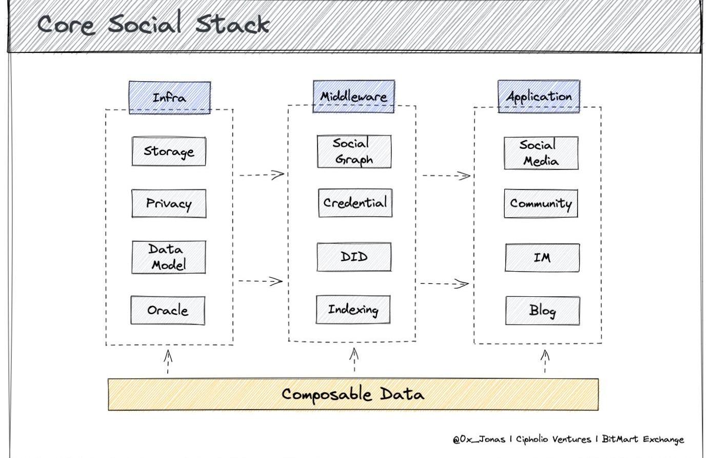 基于垂直的拆解我们也可以清楚地发现,社交领域是围绕着经典的三层框架构建的,即“基础设施—中间件—应用”。底层主要是规范类的数据传输存储和协议,中间件更多的是围绕数据可用性的核心社交图谱,上层应用与日常体验的Web2社交场景没有太大区别。