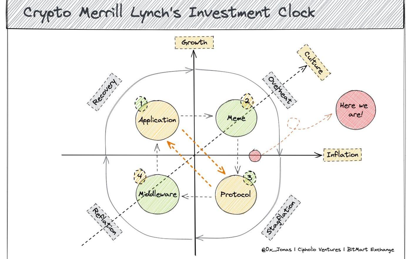 2.?过热期:中通胀→高通胀,高增长→中增长。随着通胀持续升高,市场热度逐渐达到顶峰,市场透支了高增长预期带来的技术积累+应用爆发,短期内缺乏足够的创新储备来驱动市场前行。资本在基本面分析的叙事下已经到了瓶颈,而Meme类资产之所以能够大放异彩,正是因为其独特的文化叙事属性,才能够占据资本狂欢的情绪。