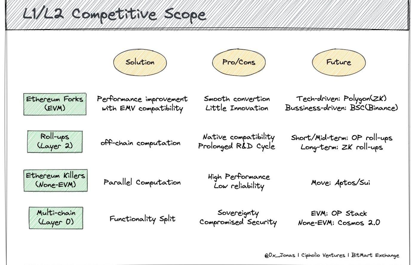 EthereumForks:随着Layer2的发展,当前牛市的流量红利,即以太坊外溢流量爆发式增长的结果,在下一个周期可能不存在,公链应着眼于Layer2的内生增长逻辑业务本身。例如Polygon一直在积极探索ZK和模块化相关领域,提出了Hermez、Miden、zkEVM等解决方案,BSC等基于交易所的公链可以依靠交易所生态提供的强大赋能获得更多流量。