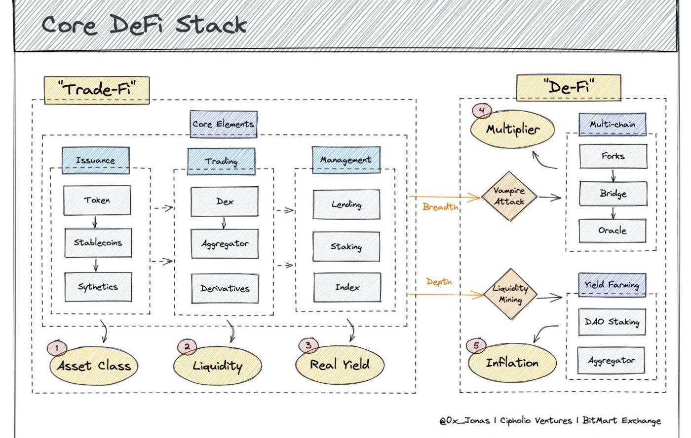 遵循上述分析框架,我们可以抽象出宏观层面影响金融市场发展的五大因素:资产类型、流动性、实际收益、资本乘数和通胀水平,分别对应资产发行、资产交易的五个核心环节、资产管理、多链和单产农业。