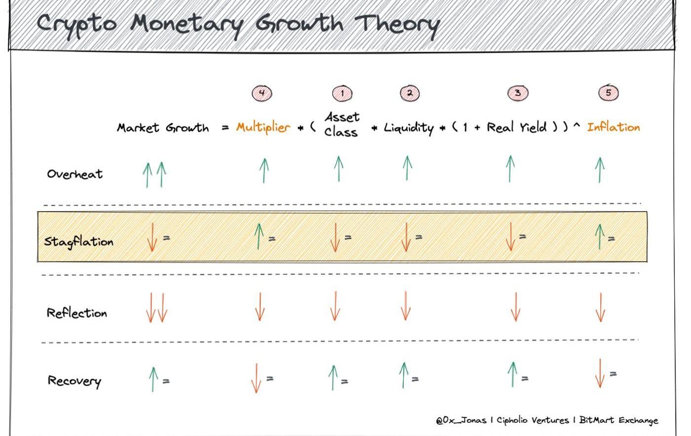 结合美林时钟理论,我们可以明显发现,目前加密市场处于滞胀阶段,资产发行量、市场流动性、实际收益率均出现明显下降,但通货膨胀水平和多链发展仍处于停滞状态。高速扩张,偶尔出现放缓趋势,最终导致整体市场略有下滑。