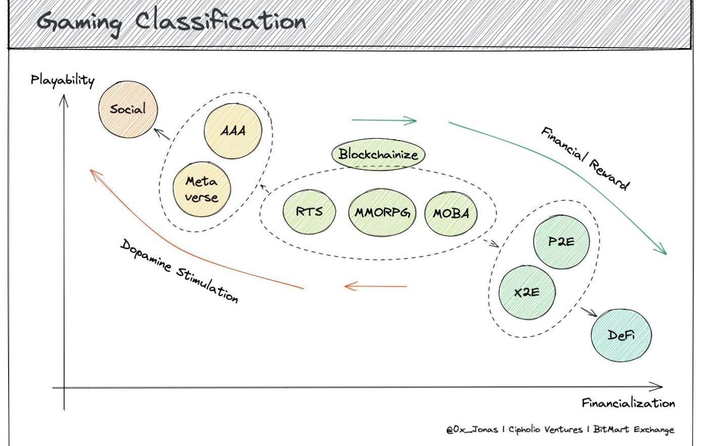 因此,我们可以看到,区块链游戏正站在选择拥抱金融化成为提供纯数学游戏的平台,还是专注于游戏内容成为下一代社交平台入口的十字路口。AAA/Metaverse和P2E/X2E都只是当前范式转换的中间产物,只是过程和手段,而不是结果。沿着区块链游戏最终会沿着社交和DeFi两个场景落地的思路,我们认为这个垂直领域会有一些值得关注的机会。