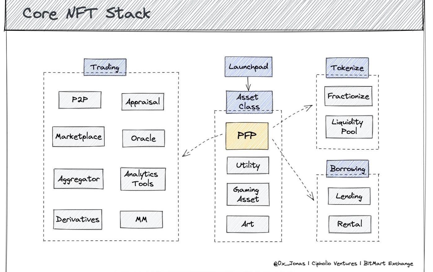 虽然大家早已熟悉我们钱包中的各种PFP,但我们认为今天将NFT归于一个独立的垂直领域还为时过早。在梳理NFT相关的产业结构时,我们发现,所谓的NFT产业其实是以PFP为核心的垂直金融市场。其产业框架与DeFi的核心框架非常相似,但更侧重于资产发行方和交易平台。