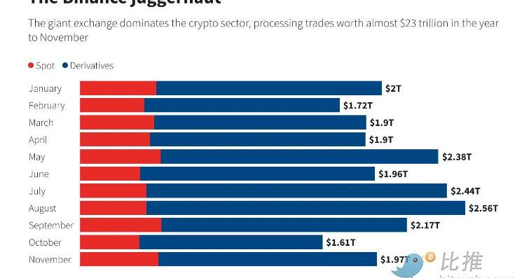 Binance对现货交易收取高达0.1%的费用,衍生品的费用结构更为复杂。路透社根据研究人员CryptoCompare的数据计算,截至10月的一年现货交易量为4.6万亿美元,币安的收入可能高达46亿美元。Binance对其16万亿美元的衍生品交易量收取高达0.04%的费用,可能已经赚取了高达64亿美元的收入。