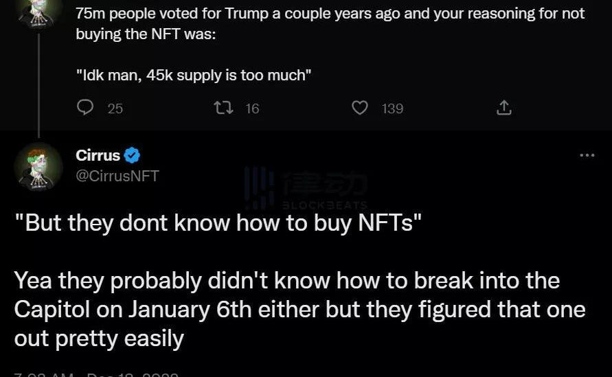 如此背景的NFTINTLLC引发了许多人的猜想。有人认为,特朗普与该项目的关联并不仅仅是往常NFT圈常见的「明星卖授权赚钱」那般简单,但目前依然缺乏足够的信息来支撑种种猜想。