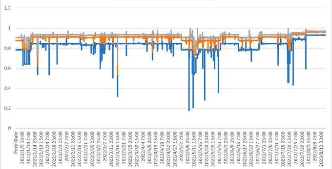 Curve的内部预言机价格与市场价格存在一定偏离。虽然偏离程度较小,但大多数情况下都有些许偏离。这说明了Curve内部预言机的价格调整存在一定时滞。