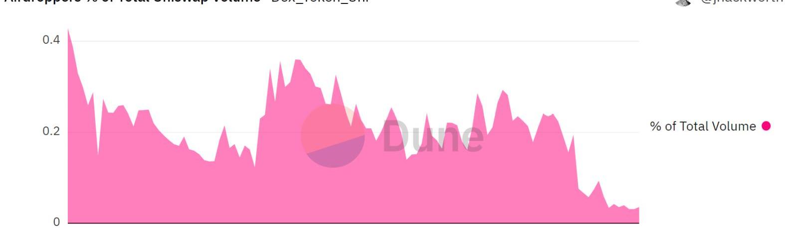 你可能会说交易量随着一般使用量的下降而下降。不过,令人惊讶的是,空投钱包正在进行一些大规模交易,并且在用户不到10%的情况下经常占每周交易量的15-40%。