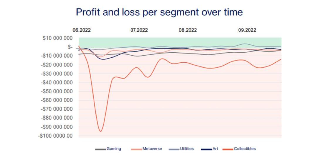 这表明NFT向新用例的过渡可能会更早而不是更晚。按类别统计的销售额数据显示,艺术品和收藏品在销售额中所占的份额正在逐渐减少,自7月以来,10月下降了42%。一种解释是,对收藏品的需求比对游戏的需求更集中;93%的流量来自NBATopShots,而Sorare则以71%份额领先。另一个原因是,事实证明,收藏品比其他领域更无利可图。NonFungible的数据显示,过去几个月投资者在收藏品上遭受的损失越来越大,也越来越稳定。因此,投资者可能正在寻找其他NFT细分市场以进行有利可图的交易,其中定制价格敏感性和专业市场等功能可以发挥关键作用。