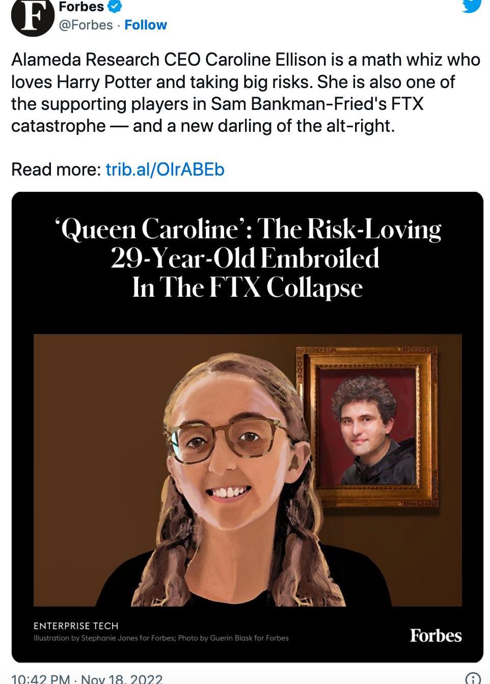 在福布斯杂志11月18日发表的一篇文章中,FTX姐妹公司AlamedaResearch首席执行官CarolineEllison被称为“卡罗琳女王”。