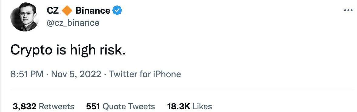 11月2日,CoinDesk发布一份私人财务文件,披露Alameda资产负债表出现了问题。@MikeBurgersburg发表了一篇题为「ALAMEDARESEARCHINSOLVENT?」的文章,并收到CZ点赞。同时,CZ发推文称,“加密货币是高风险的。”,似乎暗指Alameda.。