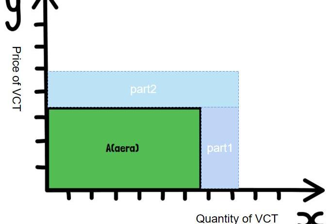 本质上,“方案3”是通过把注入价值捕获池中的新资金分为两部分来实现的。如果我们用X轴来表示当前VCT代币的数量,用Y轴来表示当前VCT代币的价格,那么绿色部分的面积就是当前整个价值捕获池中所存储的总价值。把注入价值捕获池中的新资金分为两部分。Part1用来增加当前VCT代币的数量,Part2在此基础上提升VCT代币的价格。从而保证作为效用代币价格底座的VCT代币在增发的同时还可以保持价格的稳定或者上涨。而这一切都是由“MarketDrivenMint”的通过智能合约以公开透明,且不可篡改的方式进行的。
