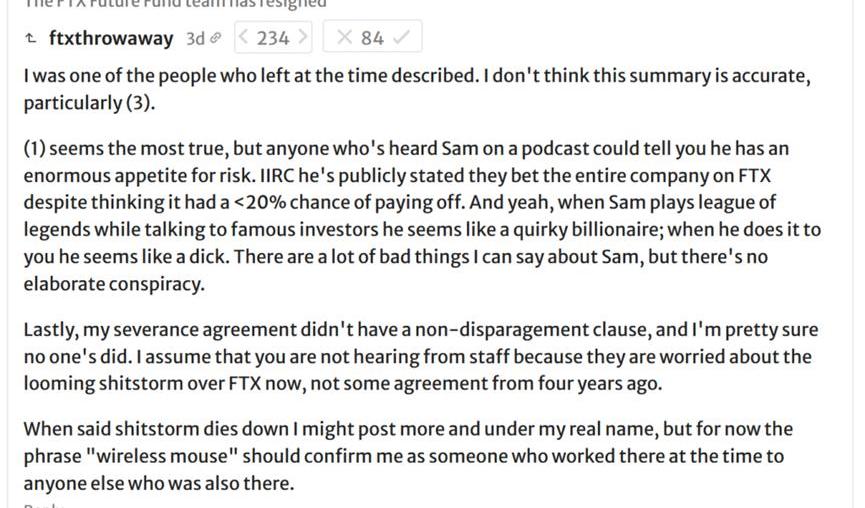 这条评论仅仅是基于评论者个人记忆的传闻;然而,提到的某些细节得到了私下与我交流的个人叙述的证实,这使我倾向于相信这是Alameda内部运作的合法和基本准确的描述。它描述了一个真正令人遗憾的状况,由于记账不善、SBF指导下的任意交易、内部管理不善和令人难以置信的糟糕组织,损失了大量资金。