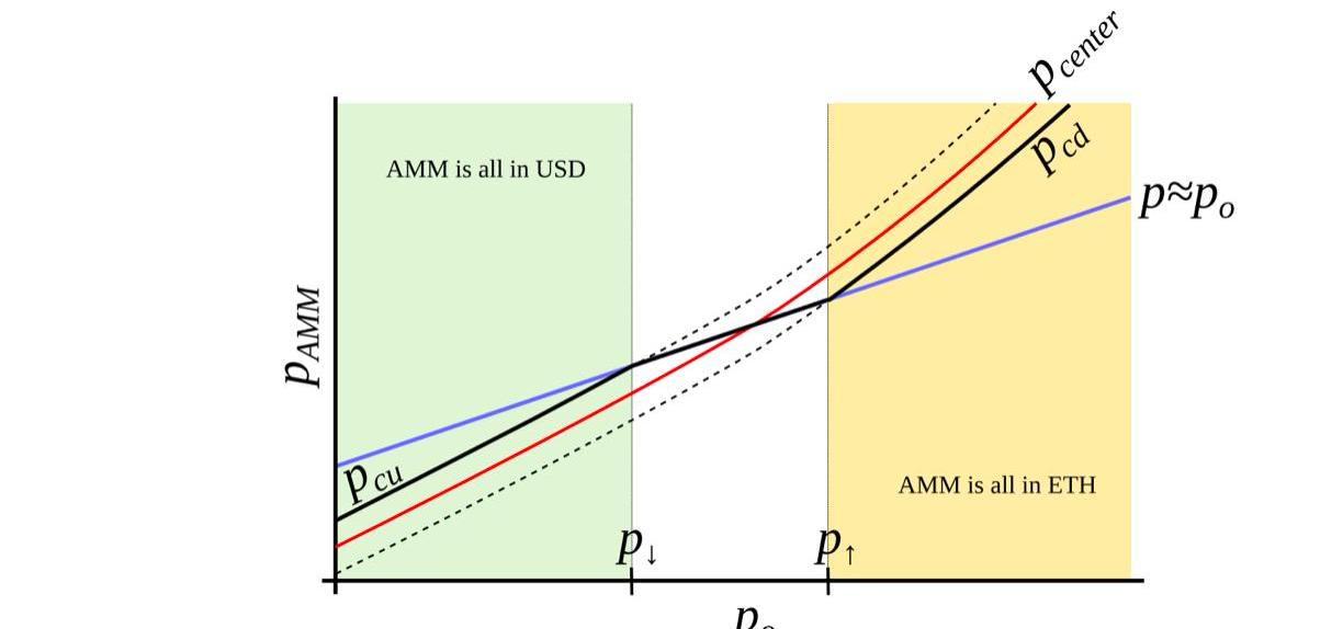 这只有通过外部预言机喂价才能实现。简而言之,如果一个人做了一个典型的AMM,并将其"中心价格"从下降到上升,代币将从USD“绝热”地转换为ETH,同时在过程中提供两种方式的流动性。这有点类似于量子物理学中的“回避交叉”。