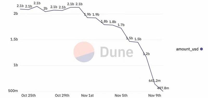 最后下跌的是非ETHERC20代币,在11月5日至11月10日期间,这些资产在平台上的价值下跌了约10亿美元。尽管其中一些原因可以归因于稳定币流出和价格下跌,但这一余额似乎下降得更缓慢,这一事实表明,FTX用户“逃往优质资产”,因为他们首先撤出规模较大、流动性更强的资产,然后转向规模较小、流动性较差的资产。