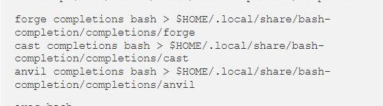 Foundry安装完后会有forge、cast及?anvil?三个指令,每个指令也都有许多option,这时有AutoCompletion会非常省事。例如产生bash用的AutoCompletionscript: