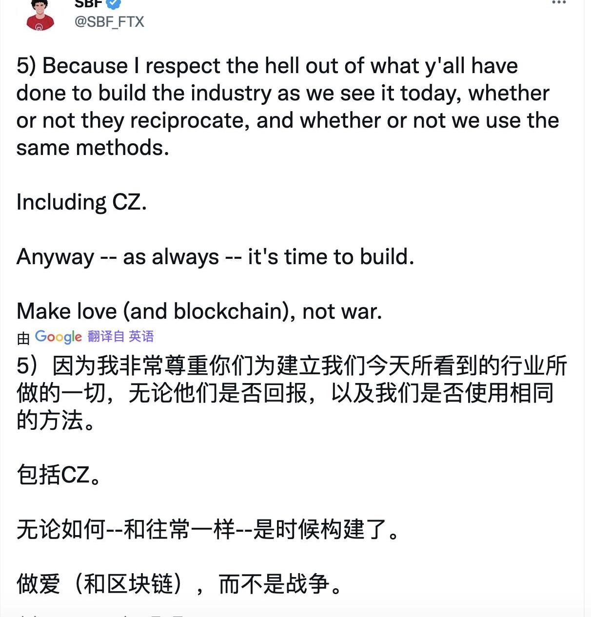 FTX创始人SamBankman-Fried发推表示:我们都在同一个市场,我祝愿推动行业发展的每个人一切顺利。因为我非常尊重人们为建立我们今天所看到的产业所做的一切,不管我们是否使用相同的方法,包括CZ。