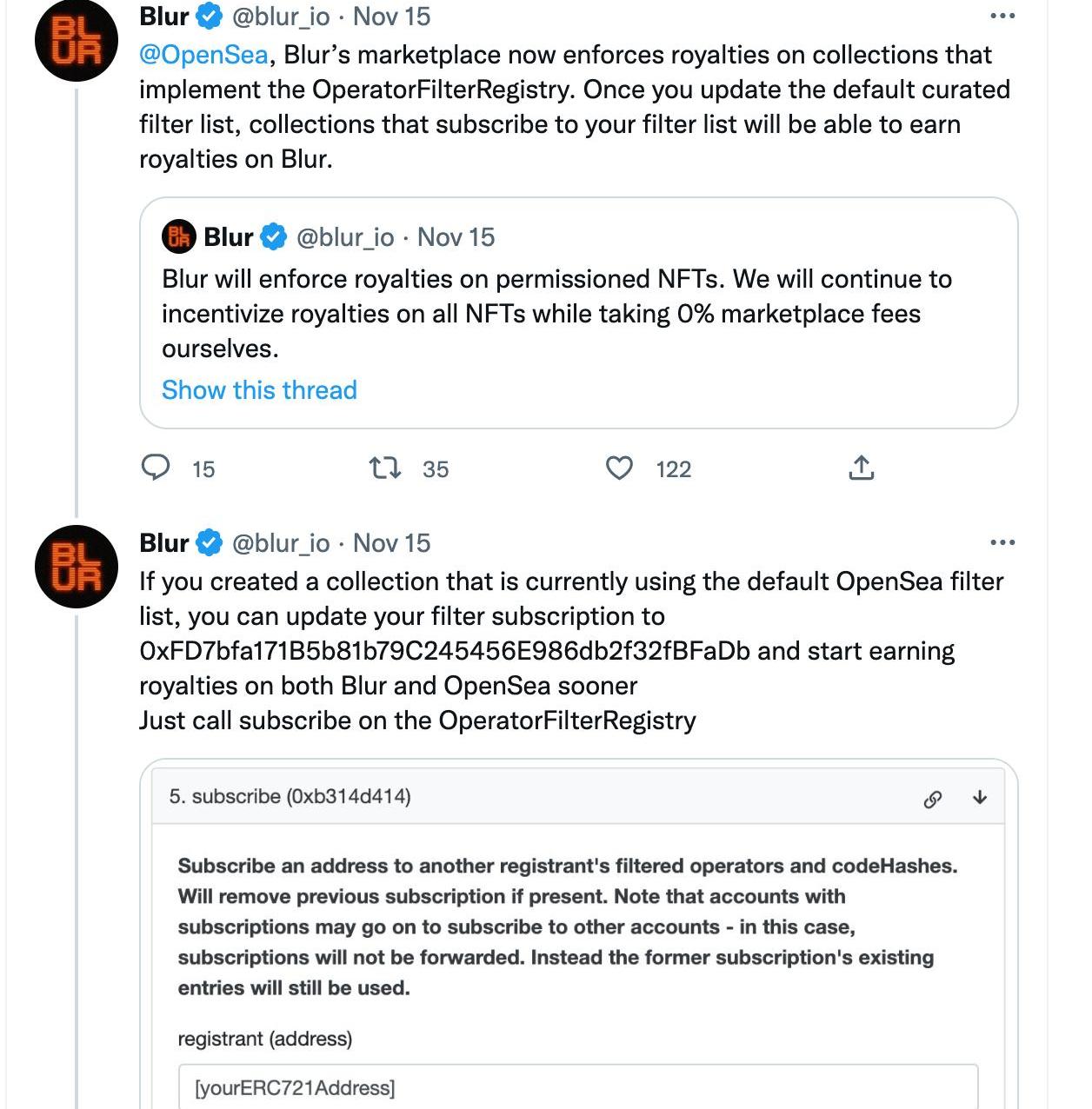 Blur在11月15号,发推特声明将会执行强制版税,并且强调建议项目方/创作者使用自己能够掌控的工具在合约层面进行强制版税征收,而不是使用Opensea的强制版税工具。