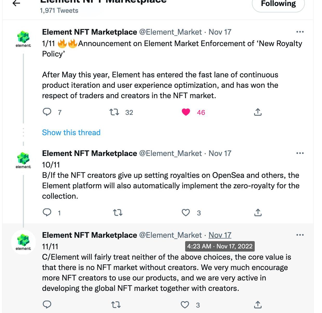 聚合交易平台Element在11月17号跟进了Opensea的版税政策,并强调始终在与创作者合作。值得注意的是,Element跟Opensea一样,在过去的几个月当中,一直没有实行0版税政策,根据笔者的体验,其产品体验在过去的三个月迭代开发当中,已经有了显著提高。