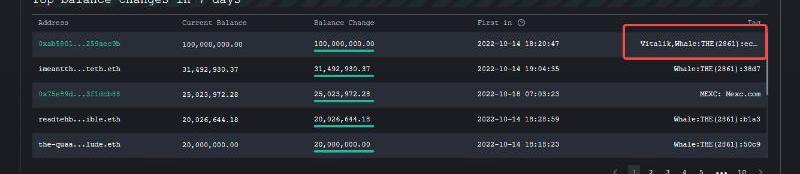 进一步分析排在前面的大户可以发现,目前持有THE数量最多的是V神,而这也是由于THE协议直接向V神地址慷慨转账所造成的结果,毕竟事情的起因也源自于V神的一句玩笑话。
