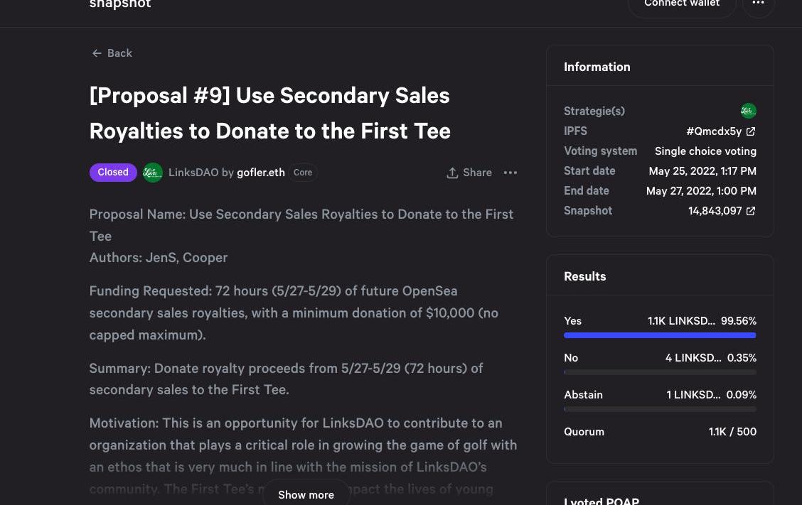 通过Snapshot投票,多数人支持并通过了LinksDAO最近的一项提案,将72小时二次销售的版税收入捐赠给FirstTee慈善机构,这是一个围绕高尔夫运动的青年发展组织。
