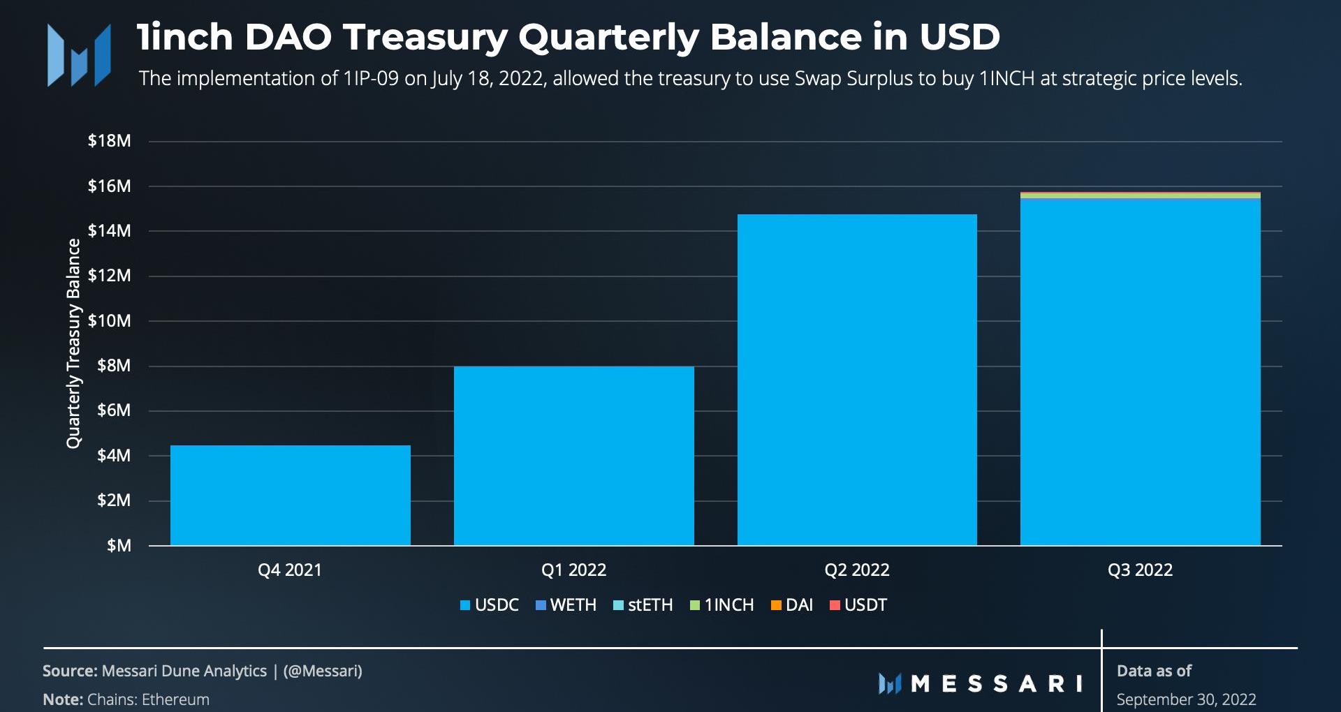 交易量和代币掉期主要由USDC、USDT和BUSD等稳定币以及WETH和WBTC等波动性资产驱动。新的1inch提案实施实现,为资金库添加了新的代币。然而,网络容量的大幅下降,减缓了1inch在2022年第三季度的资产负债表增长。