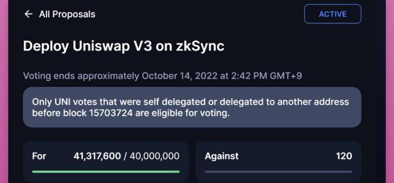 Uniswap治理投票刚通过了4千万张"赞成"票,预计UniswapV3将在4-6周内在zkSync上部署。