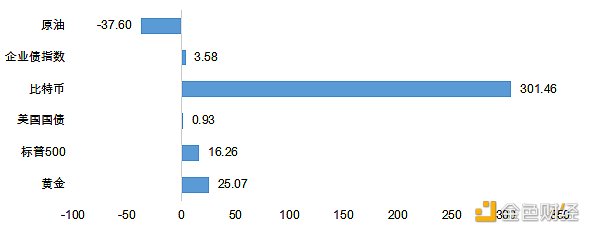 比特币较全球主要大类资产收益率遥遥领先,2020年高达301.46%。从市场收益率上看,在过去的一年里,同期标普500指数的收益率为16.26%,被市场追捧的黄金为仅仅为25%,可以说比特币在2020年的表现已远超过了其他所有的大类资产。