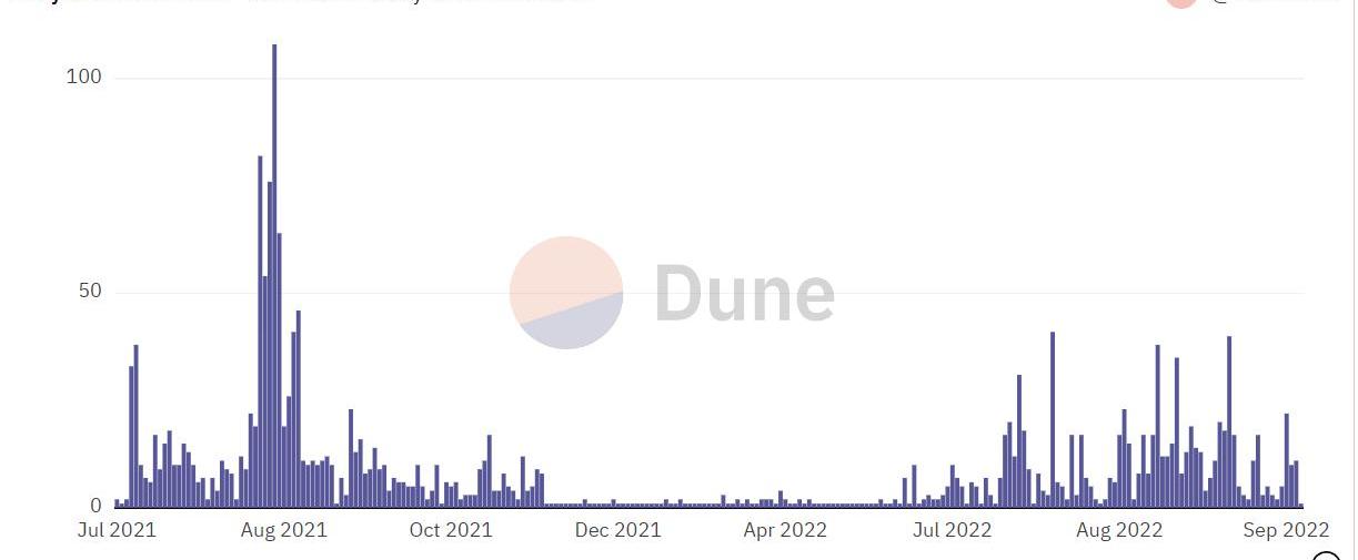 Fractional在去年八九月份的交易量是非常惊人的,曾一度达到2亿美金,然而在当前的熊市下,日均交易量不足去年零头。虽然交易量下滑,但是新增碎片化池子数量已经回增至接近去年同期水平。