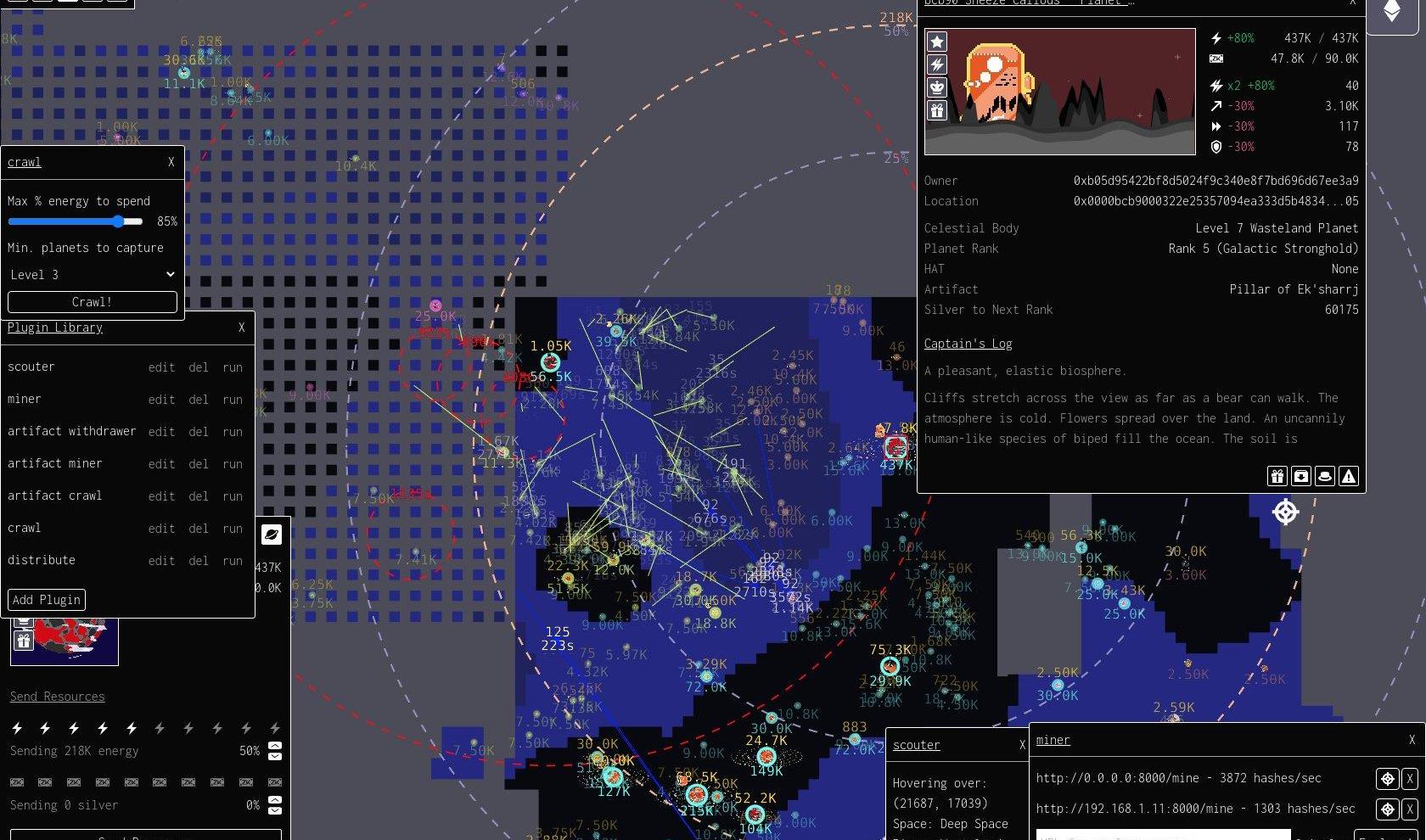 我想明确指出的关于客户端的另一件事是,顶级玩家为玩游戏而编写了非常高复杂度的自动化bot。所有这类活动在黑暗森林中都是公平的游戏,黑暗森林智能合约只是指定了规则或宇宙的物理规律,遵守这些规则,你可以做任何你想做的事。到2022年,一些顶级玩家已经创造了工具,允许他们几乎完全抽象出《黑暗森林》的基本关卡玩法机制,而不是单独行动。相反,玩家操作的是更复杂的指示板,包含更高级别的启发式和策略,比如按下按钮将银币分配到该区域所有升级的星球。这些脚本将翻译这些更高层次的策略,并为他们的行动奠定基础。在这个意义上,玩家基本上是在编写自己的游戏体验,玩家创建的第三方工具,成为玩家游戏体验的一部分。