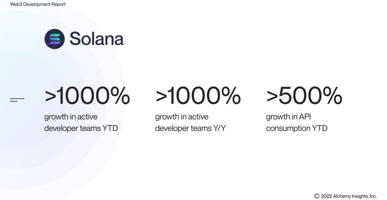 Solana是使用Rust编程语言构建的第一层智能合约开发平台。Alchemy在2022年第三季度开始支持Solana开发者。到目前为止,Solana的活跃开发者团队已经同比增长了1000%,今年迄今为止,API消费YTD增长了500%。