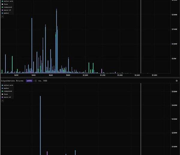在清算入口包括了MakerDao,Compound和AAVE为主的高TVL的DeFi,在价格上涨的时候几乎没有用处,但是当价格下跌的时候,该数据就可以清楚的看到危险位置的清仓量,可以很好的预期到如果发生连环爆仓的时候,价格可以下跌到什么样的位置。