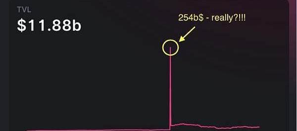 从上图官方报道的数据可以看到,TVL在2022年3月6日从5亿美元稳步增长到45亿美元。但发生了一些疯狂的事情,在2022年3月7日,TVL被报道为2540亿美元。这比整个以太坊网络有史以来最高的TVL还要多2.5倍,且在一天之内发生这样的变化。显然,这个数据的错误的。在接下来的几周,官方报道TVL为100-200亿美元。